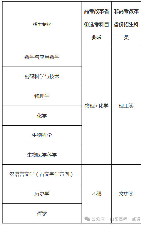 对比山东大学2025年强基计划的招生专业,我们可以发现,在原有数学与应用数学、物理学、化学、生物科学、生物医学科学、汉语言文学(古文字学方向)、历史学、哲学等8大专业9个方向的基础上,2026年新增“密码科学与技术”专业强基招生,和数学、物理等理科专业一样,在高考改革省份的选考科目要求为物理和化学。