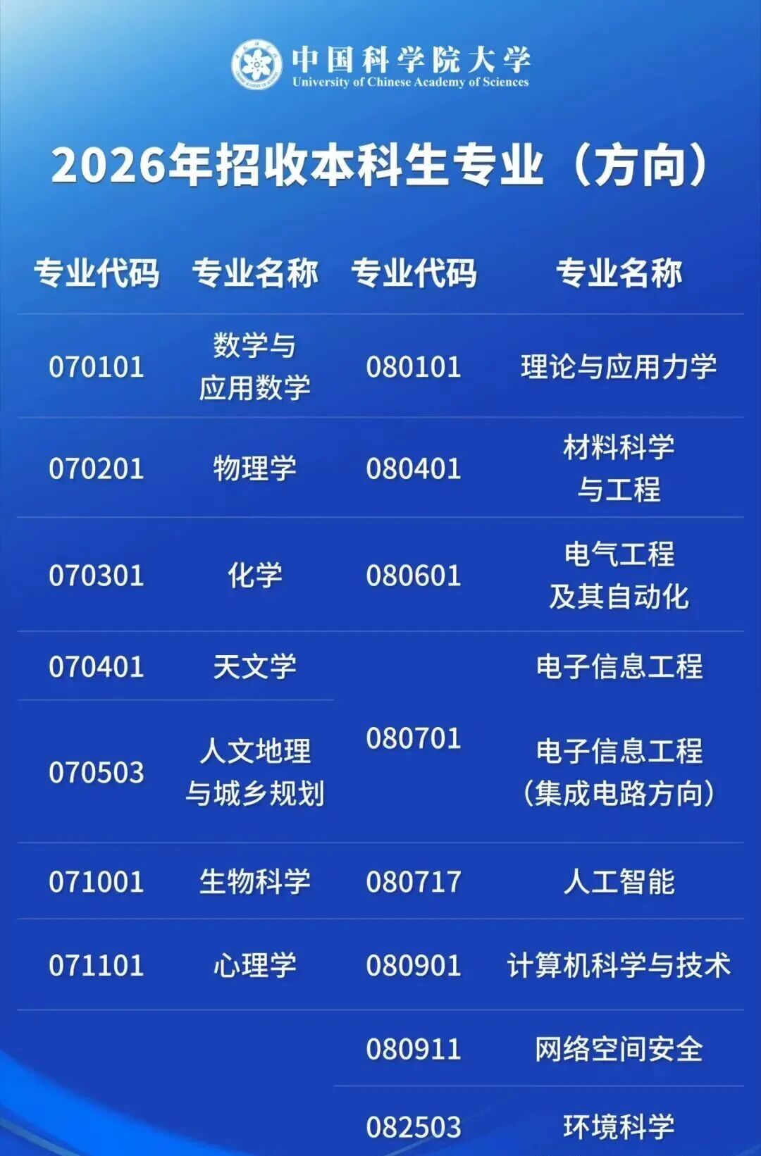 2026年国科大共16个专业(方向)招收本科生,具体专业如下: